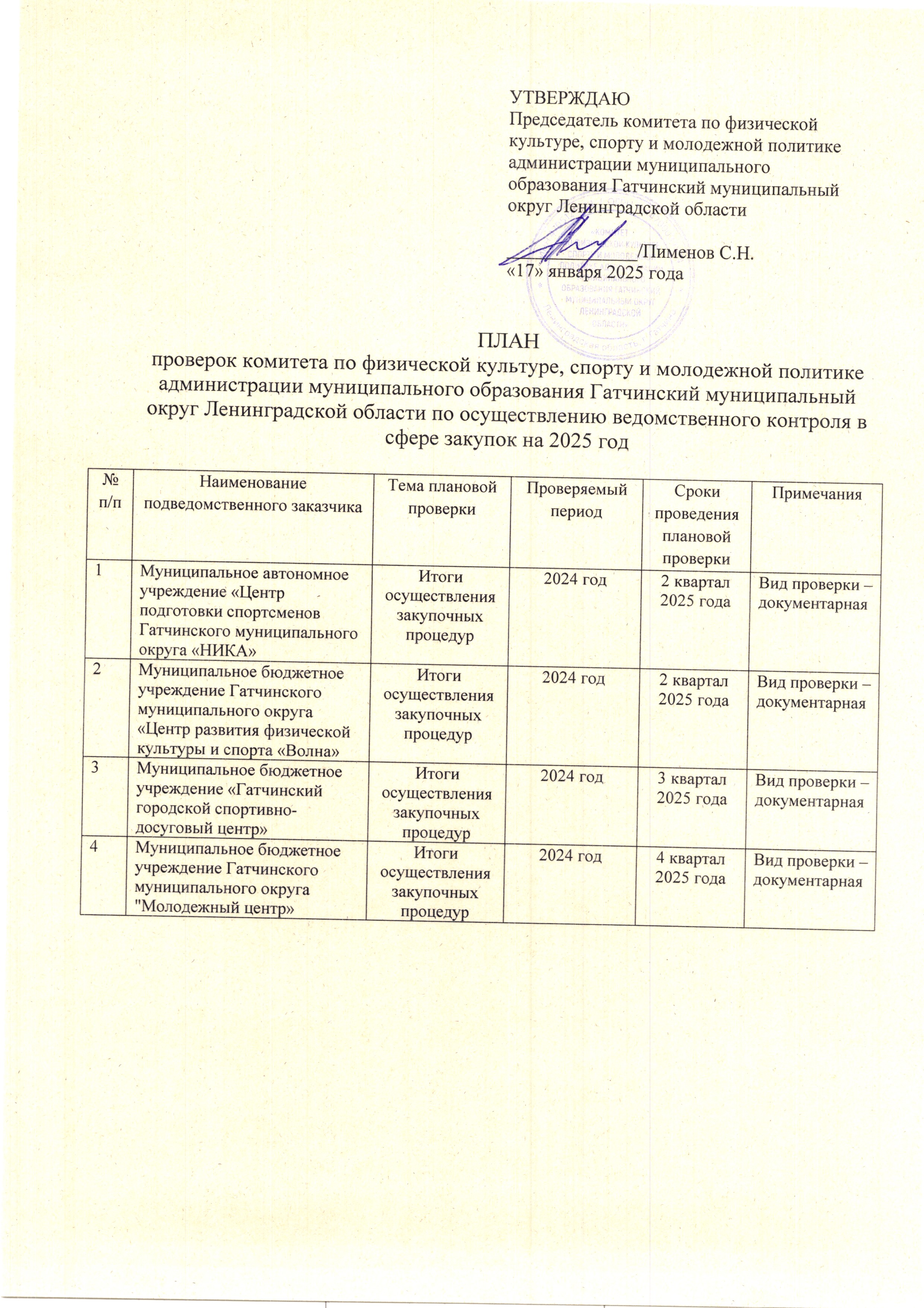 План проверок комитета по физической культуре, спорту, туризму и молодежной политике администрации Гатчинского муниципального района по осуществлению ведомственного контроля в сфере закупок на 2024 год