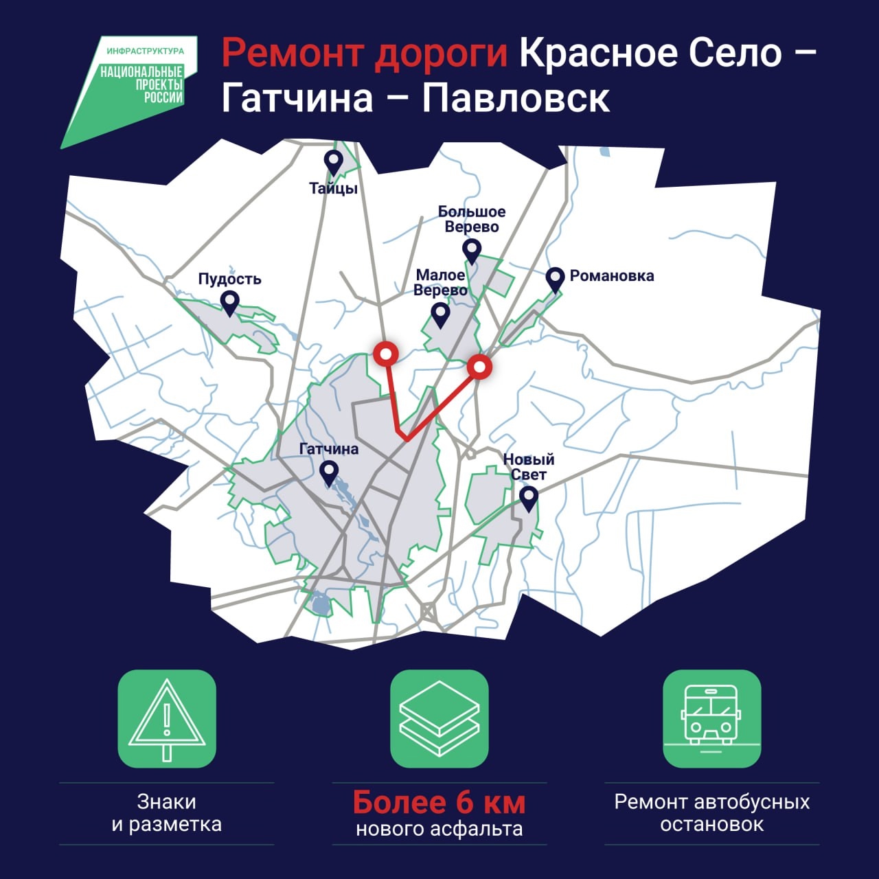 В Гатчинском муниципальном районе стартовали ремонтные работы – на участке дороги Красное Село – Гатчина – Павловск протяженностью более 6 километров (затронет часть Красносельского и Пушкинского шоссе).