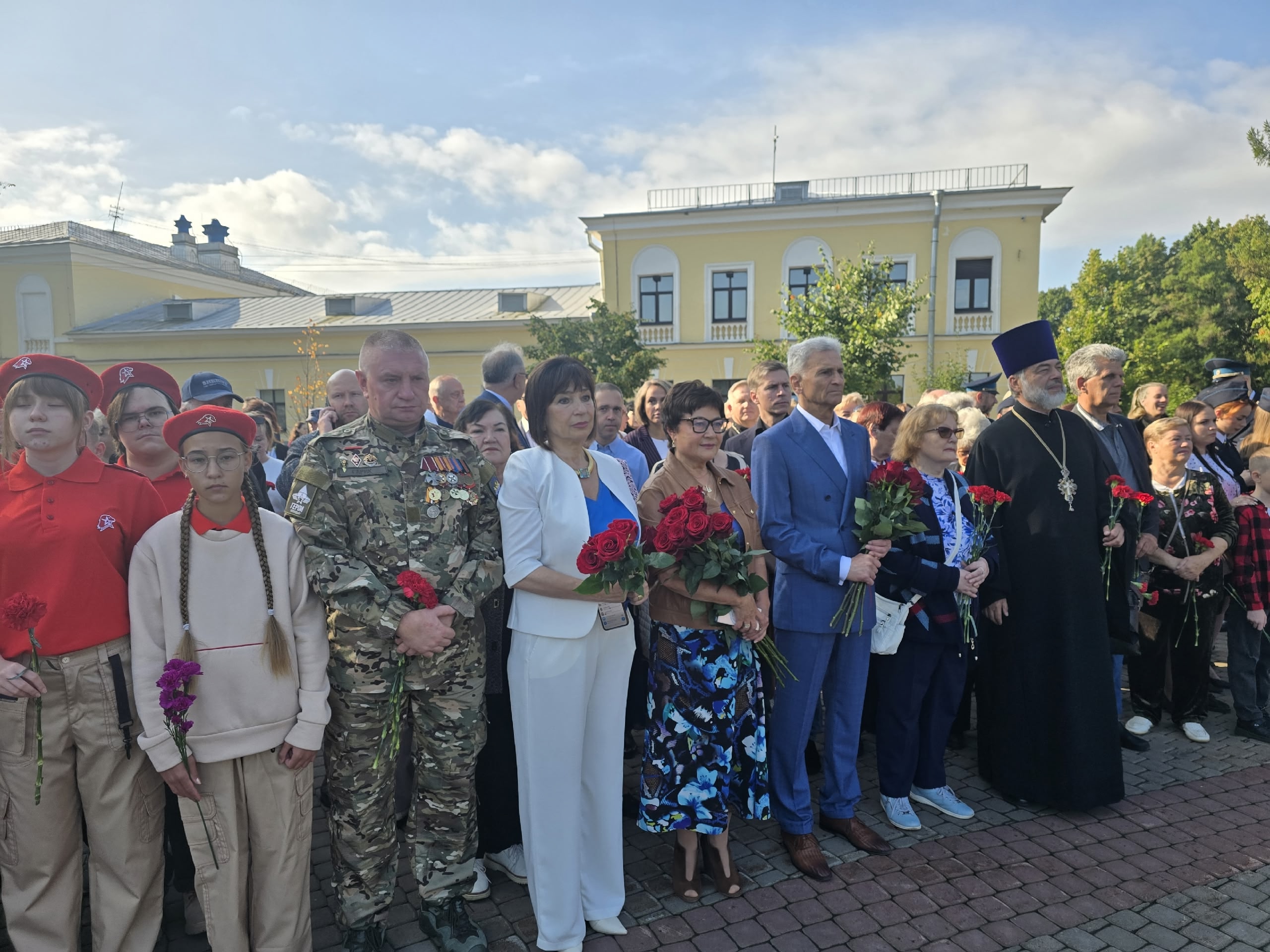 Людмила Нещадим, руководитель приемной губернатора в Гатчинском округе Людмила Сенькина, депутаты Законодательного собрания Ленинградской области, участники СВО, ветераны, сотрудники администрации, руководители гатчинских предприятий и организаций, школьники, кадеты, чтобы возложить цветы к подножию обелиска.