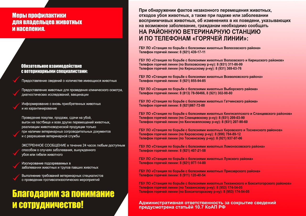 При обнаружении фактов незаконного перемещения животных, отходов убоя животных, а также при падеже или заболевания восприимчивых животных, об изменениях в их поведении, указывающих на возможное заболевание – гражданам необходимо сообщать в станцию по борьбе с болезнями животных Гатчинского района +7(921) 867-72-00 или по телефону Управления ветеринарии Ленобласти - 8(812) 539-44-32!