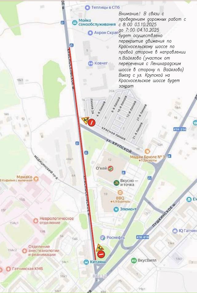 Выезд с ул. Крупской на Красносельское шоссе будет закрыт.