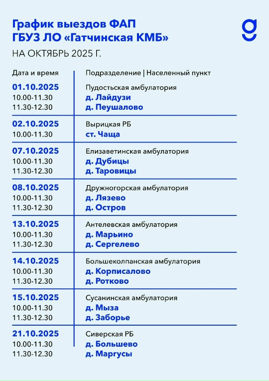 Специалисты Вырицкой и Сиверской районных больниц, сельских амбулаторий и фельдшерско-акушерских пунктов проведут в октябре выездные приемы жителей отдаленных населенных пунктов.