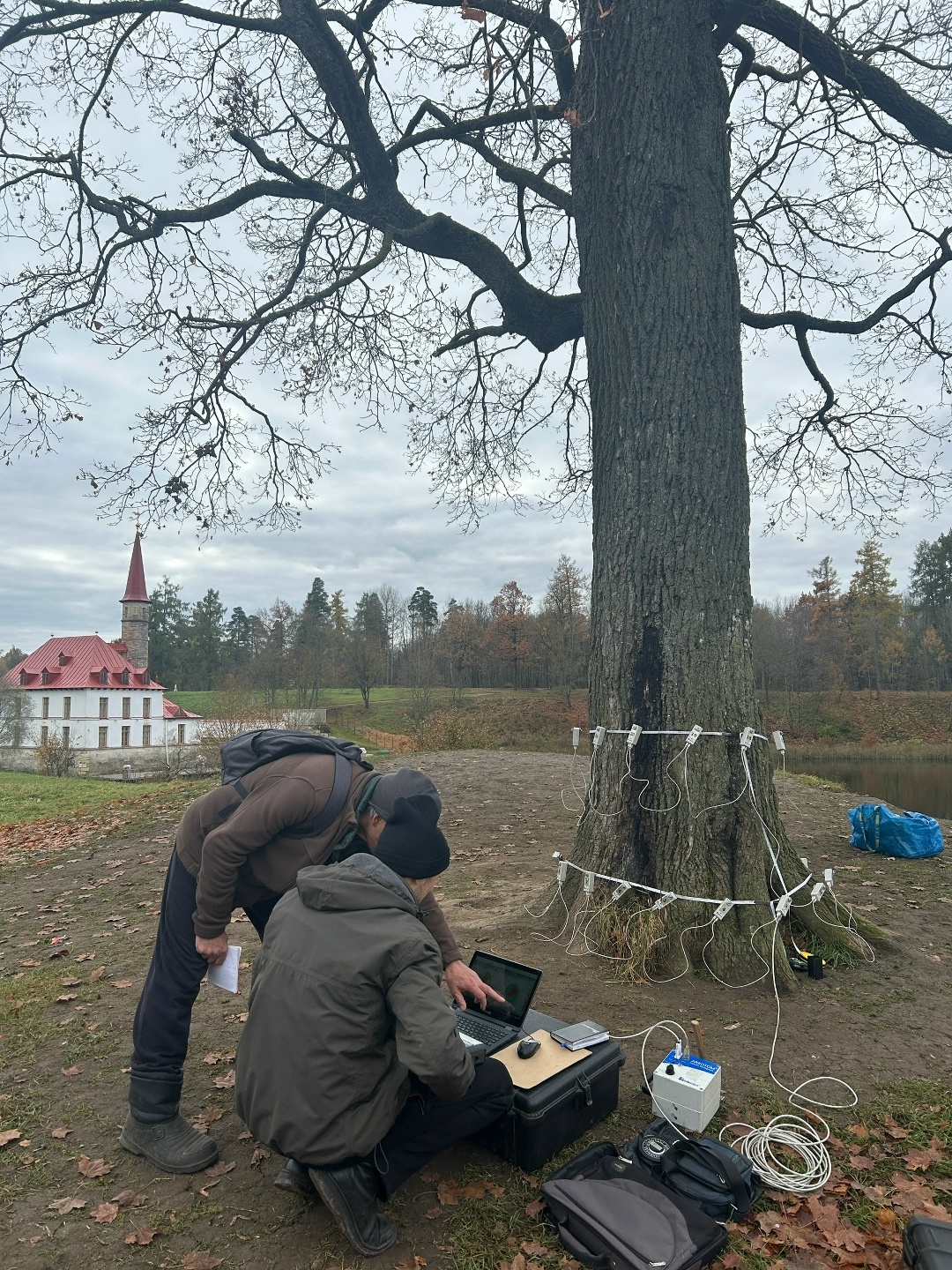 Корневая система обследуется в радиусе до 2,5 метров. С помощью специального томографа можно будет уточнить расположение свободных и связанных с деревом корней.