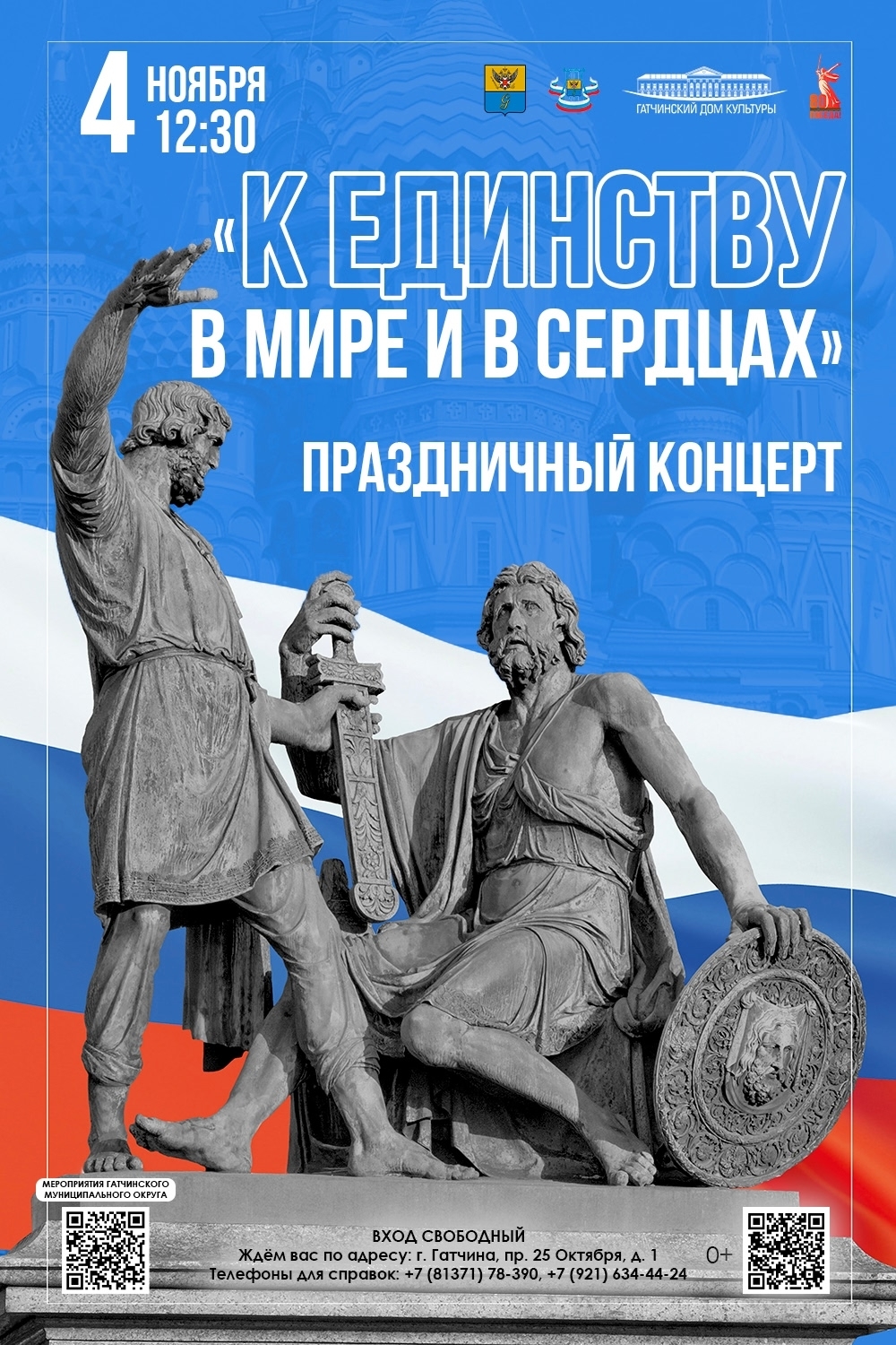 Гатчинского Дома культуры состоится праздничный концерт «К единству в мире и в сердцах!», посвящённый Дню народного единства!