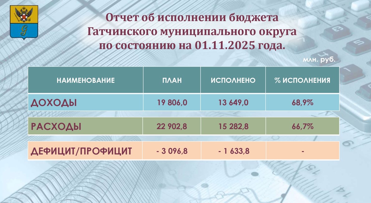 Предлагаем вам ознакомиться с кратким отчетом об исполнении бюджета Гатчинского муниципального округа по состоянию на 01.11.2025 года.