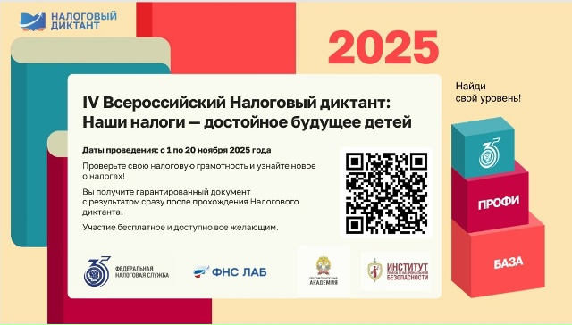 В ноябре 2025 года стартовал IV Всероссийский Налоговый диктант: «Наши налоги – достойное будущее детей», который проводится ФНС России совместно с Президентской академией.