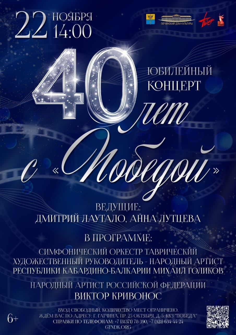 22 ноября 2025 года Киноконцертный зал «Победа» приглашает жителей и гостей столицы Ленинградской области, города Воинской славы Гатчины на праздничную концертную программу, посвящённую юбилею учреждения.