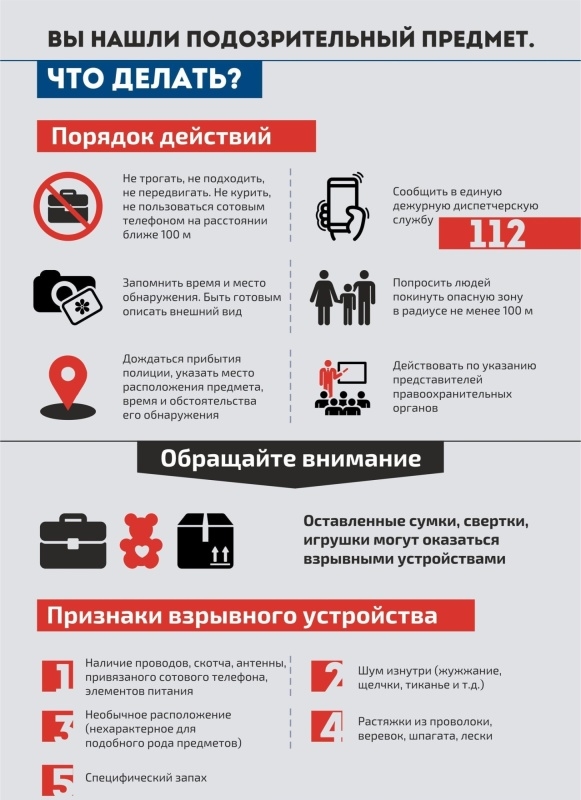 Если вы обнаружили бесхозный предмет, который вызывает у вас сомнения, ни в коем случае не прикасайтесь к нему и не пытайтесь его перемещать. Отойдите на безопасное расстояние и предупредите окружающих о возможной опасности. Не допускайте скопления людей вблизи подозрительного объекта.