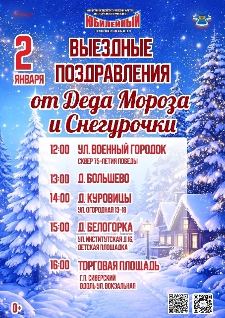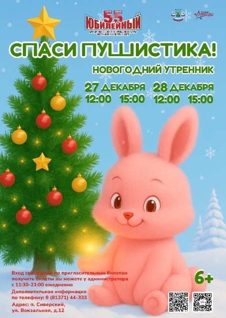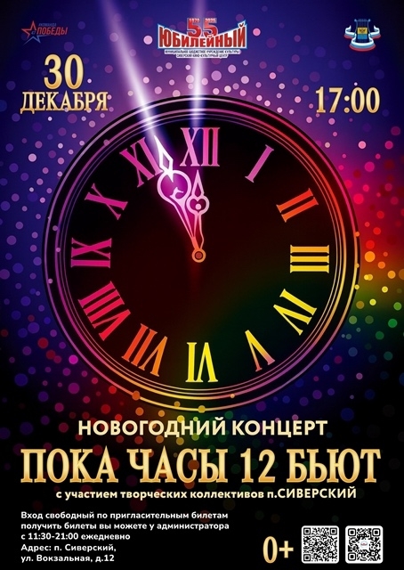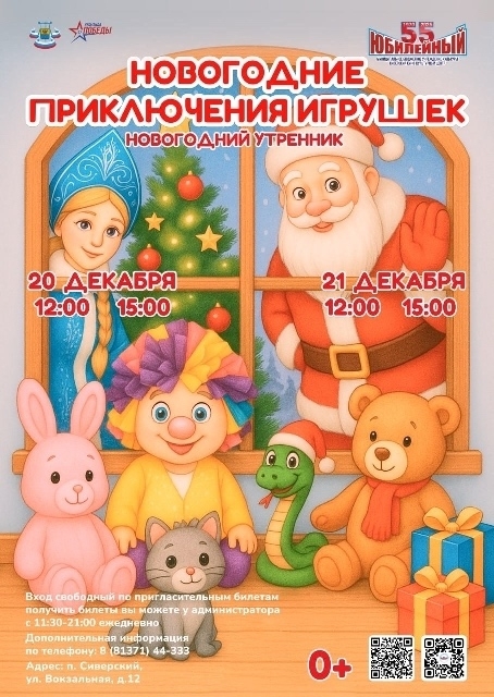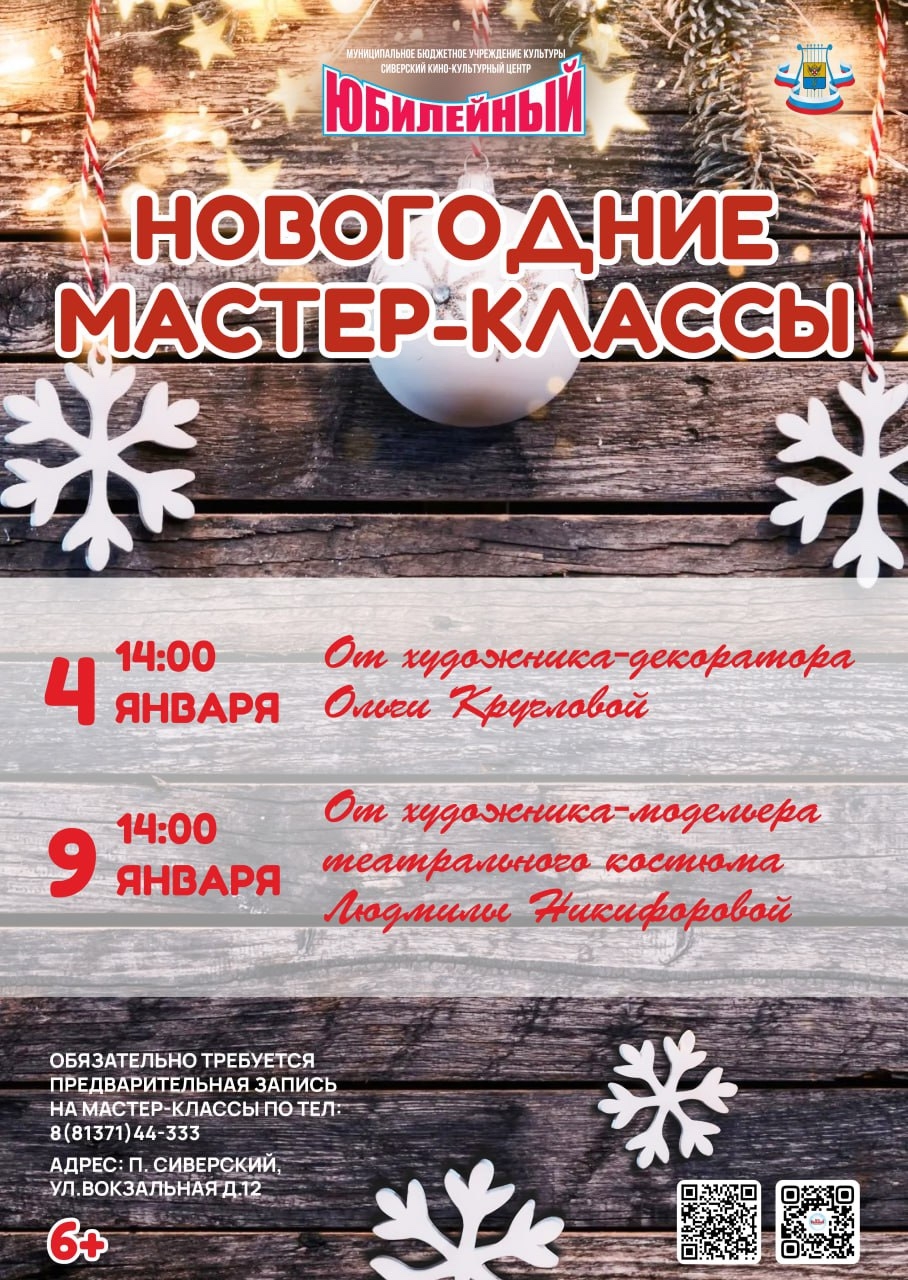 Дорогие жители и гости п. Сиверский! Новый год – один из самых весёлых и волшебных праздников, который любят и отмечают все. Он дарит чудо, переносит в настоящую сказку, в которой не только дети, но и взрослые могут осуществить свои желания. Целая череда ярких незабываемых и зрелищных мероприятий пройдет в МБУК СККЦ "Юбилейный" в новогодние дни: новогодние утренники, концерты, театрализованные представления. Каждый сможет посмотреть или поучаствовать в любом из них и получить заряд бодрости на Новый год. 20 декабря в 12.00 и 15.00 21 декабря в 12.00 и 15.00 - "Новогодние приключения игрушек". Новогодние утренники. 0+ 27 декабря в 12.00 и 15.00 28 декабря в 12.00 и 15.00 - "Спаси Пушистика ". Новогодние утренники. 6+ 30 декабря в 17.00 - " Пока часы 12 бьют". Новогодний концерт с участием творческих коллективов МБУК СККЦ "Юбилейный" . 0+ 2 января - Выездные поздравления от Деда Мороза и Снегурочки. 0+ 4 января в 14.00 - мастер - класс от художника - декоратора [id247133526|Ольги Кругловой] ! 6+ 9 января в 14.00 - мастер - класс от художника - модельера театрального костюма [id216721273|Людмилы Никифоровой] ! 6+ Вход на все мероприятия свободный! На детские утренники просим получить пригласительные билеты у администратора [club73107998|МБУК СККЦ "Юбилейный"] . На мастер - классы, пожалуйста, заранее запишитесь по тел. 8(81371) 44333.